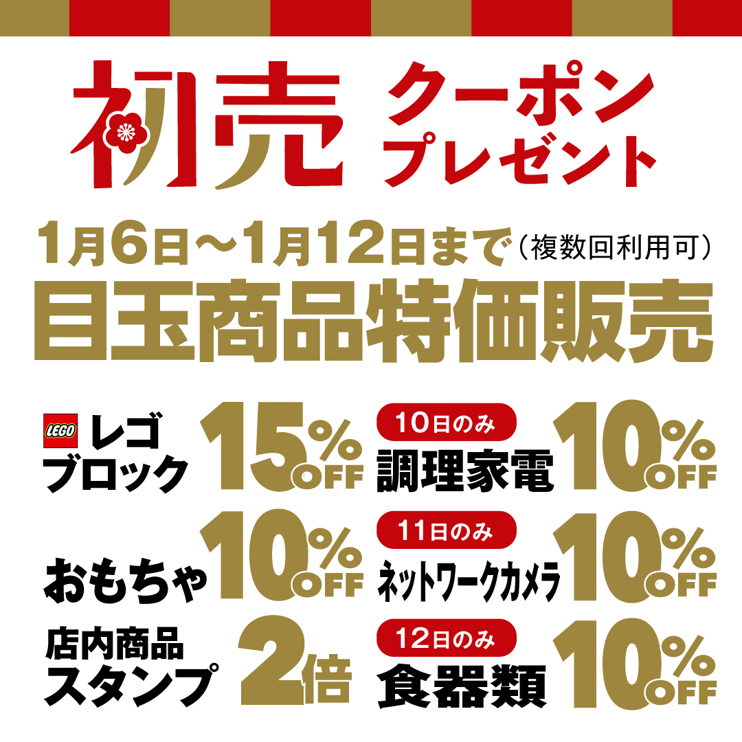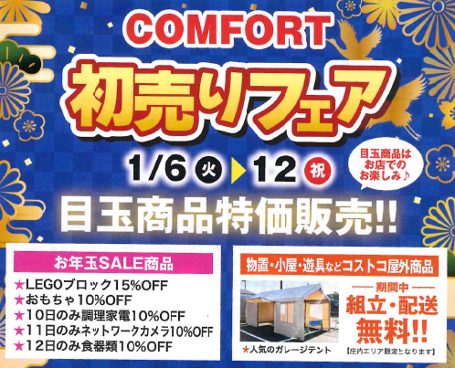 「酒田レンタル コンフォート店」にて、1月6日~12日(月・祝)まで、初売りを開催。 期間中は子供が喜ぶおもちゃや目玉商品が限定大特価!さらに週末には、家電や食器をはじめ、 近年関心が高まっているネットワークカメラなどを、日替わりでセール価格にて販売。 また期間中は店内商品がスタンプ2倍に!人気のコストコ商品をお年玉価格で手に入れるチャンス。 初売り企画は、LINE友だち登録でお得なクーポンをもらえるので、まだの方はスタンプも貯まる この機会にぜひご登録を! |